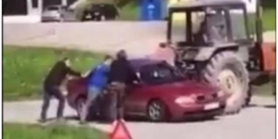 Razmenili su nekoliko reči i dođoše na genijanu ideju - da trktorom prenesu auto. Bukvalno.