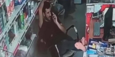 On je na radnom mestu, a ponaša se bahato, pa drži noge na pultu.