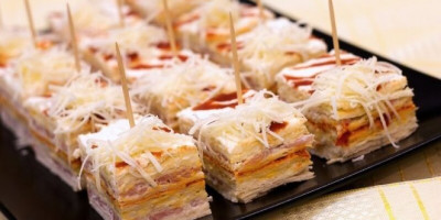 Slaganje : kora, fil sir, kora, fil šunka, kora, fil ajvar, kora, pa ponavljamo još jednom. Mažemo na koru malo manje od pola smese da bi nam ostalo po malo od svake da namažemo i sedmu koru. za sedmu spojimo sve ti i umutimo pa premažemo.