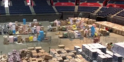 Ispred Arene zatekli smo kamione, kutije i viljuškare, a unutar nebrojano mnogo kutija, proizvoda, namirnica koje neumorni ljudi iz organizacije i volonteri pakuju i prosleđuju u distribuciju.