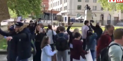 Grupa ljudi juče se zagrlila ispred zgrade britanskog Skotland jarda nedaleko od zgrade parlamenta, a neki od njih su nosili transparente sa natpisom "Moje telo, moj izbor".