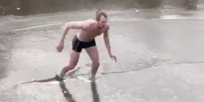 Jedan sugrađanin poušao ej da glumi facu, pa je samo u gaćama i sa klizaljkama izašao na led. Samo, uzgleda da je i tako bio pretežak, pa je na kraju završio u ledenoj vodi, bireži se za život!