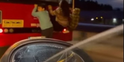 Dvoje dece, dečak i devojčica, drže se za zadnji deo gradskog autobusa koji juri ulicama Žarkova!