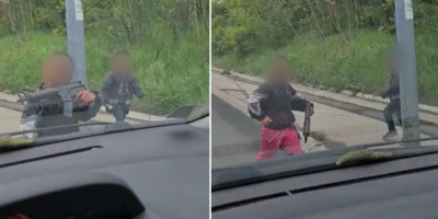 Dva dečaka na ovoj raskrsnici prilaze automobilima i žickaju pare držeći u rukama igračke oružje!