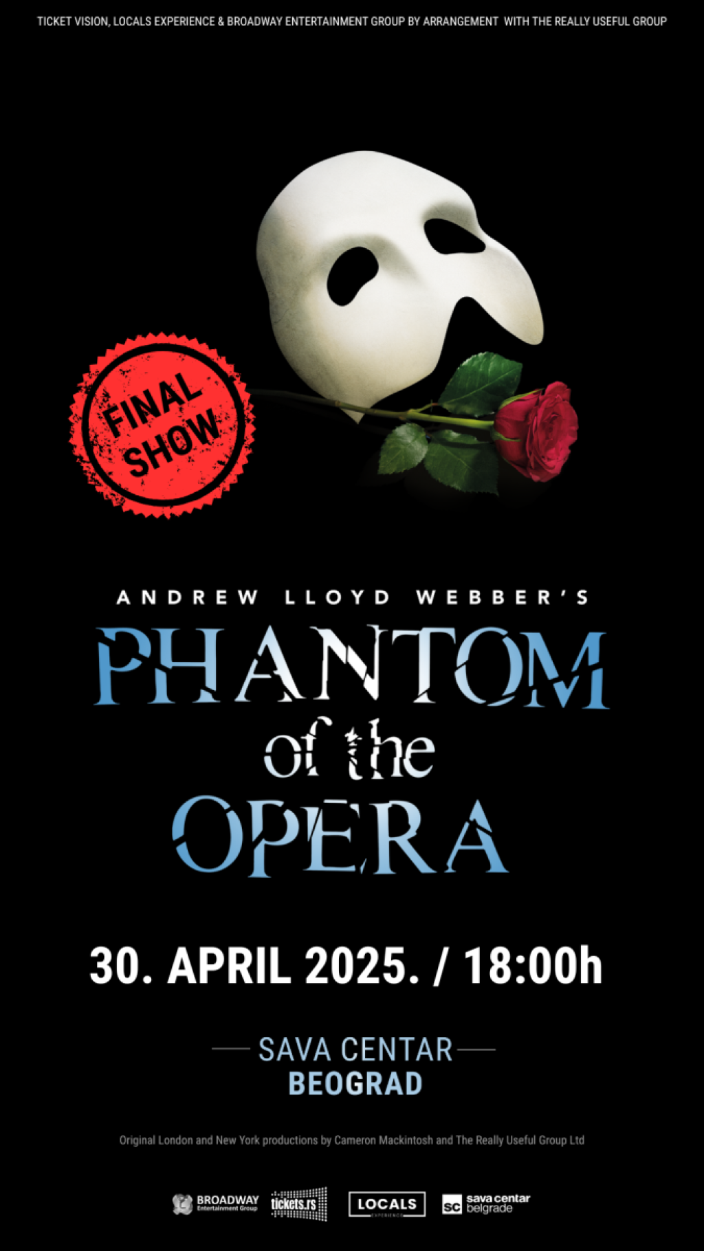 "Fantom iz opere" u Beogradu dolazi u svojoj originalnoj verziji, i ovo je prilika koja se, prema rečima organizatora, neće ponoviti u skorije vreme. Predstava se izvodi na engleskom jeziku, u punom scenskom sjaju i uz orkestar uživo. Reč je o najnagrađivanijem mjuziklu Endrua Lojda Vebera, koji je do sada osvojio više od 70 prestižnih nagrada, uključujući sedam Toni i četiri Olivija nagrade, a pogledalo ga je više od 160 miliona ljudi širom sveta.