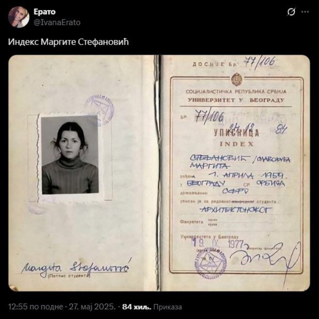 Margita Stefanović je arhitekturu upisala davne 1977. godine u Beogradu, a tada je i nastala fotografija iz njenog indeksa koja je postala viralana na društvenim mrežama.