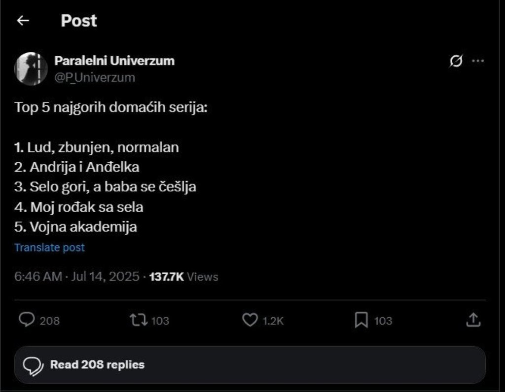 Jedan tviteraš objavio je svoju listu Top 5 najgorih domaćih serija, nakon čega su ga brojni korisnici ove društvene mreže žestoko napali.