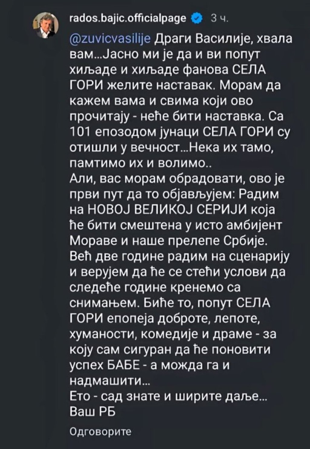 "Dragi Vasilije, hvala vam. Jasno mi je da i vi, poput hiljade i hiljade fanova "Sela gori", želite nastavak. Moram da kažem vama i svima koji ovo pročitaju - neće biti nastavka. Sa 101 epizodom junaci sela gori su otišli u večnost. Neka ih tamo, pamtimo ih i volimo", napisao je Bajić, ali nije stao tu.