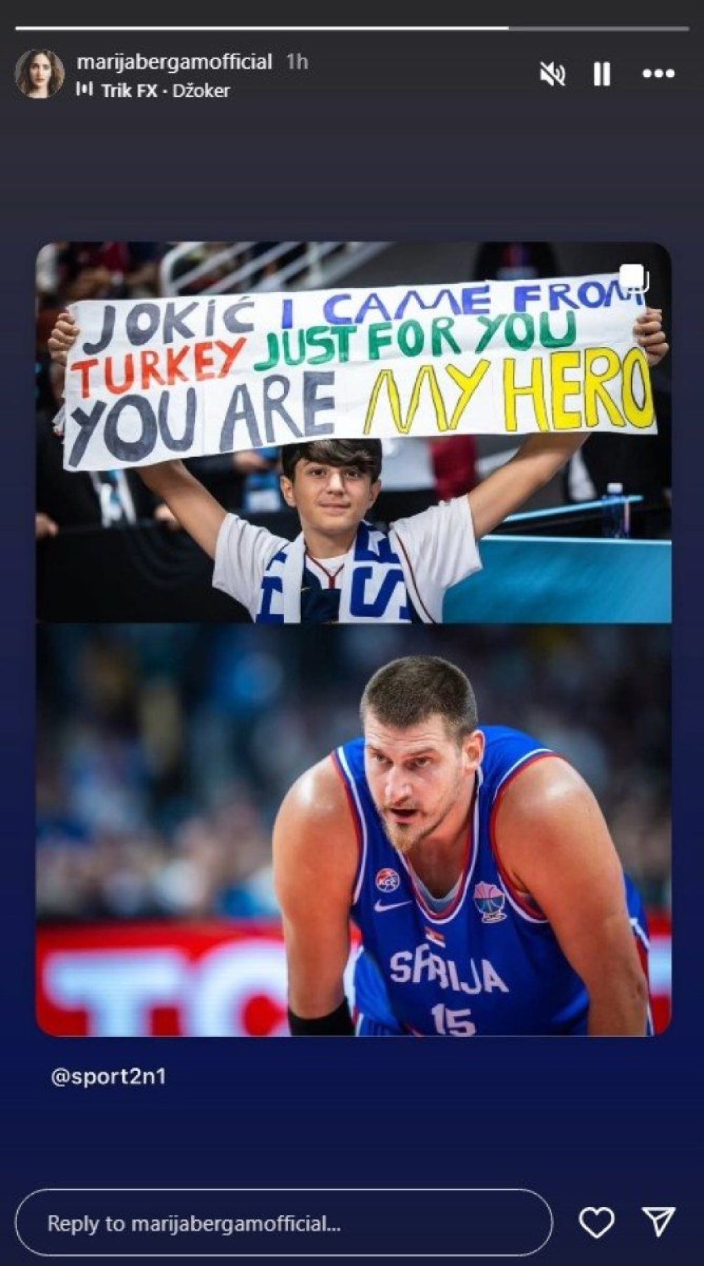 Na fotografiji koju je podelila Marija Bergam vidi se dečak koji drži natpis: "Jokiću, došao sam zbog tebe iz Turske. Ti si moj heroj." Ovaj dirljivi trenutak pokazao je koliko ljubavi i poštovanja Nikola Jokić izaziva među navijačima, ne samo u Srbiji, već i širom sveta.
