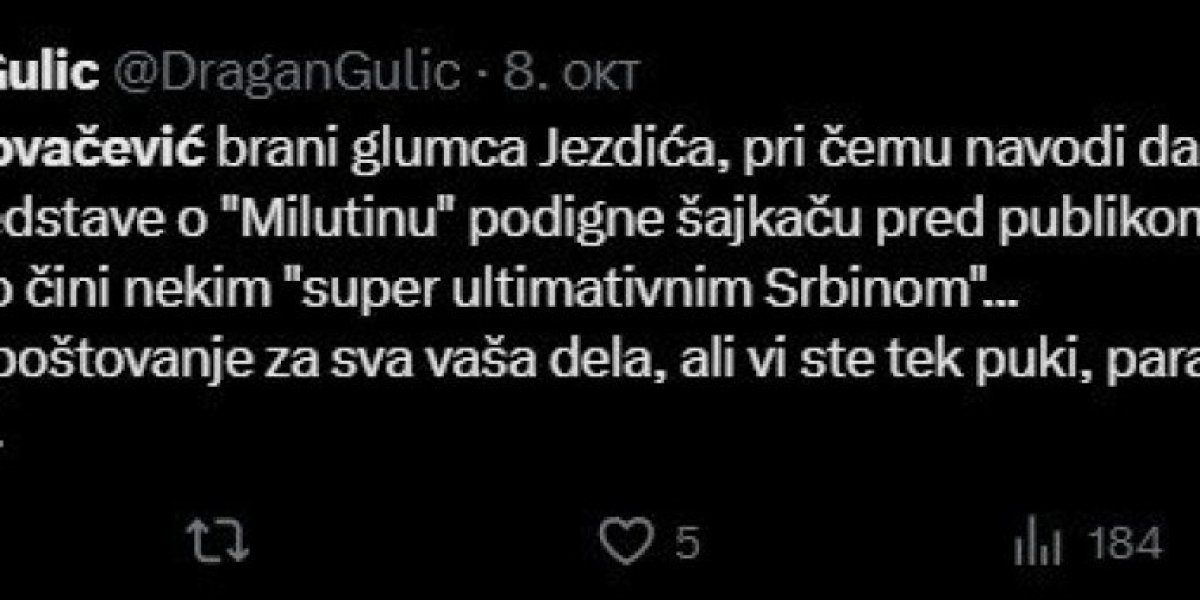 Podsetimo, Kovačević je posebno naglasio simboliku i doslednost kojom Jezdić završava svaku izvedbu predstave "Knjiga o Milutinu" u Zvezdara teatru podizanjem šajkače u znak pozdrava publici.