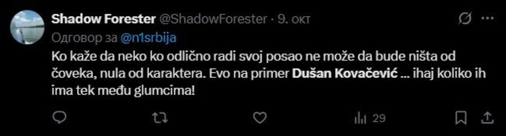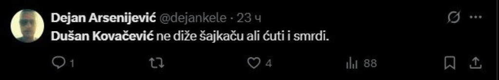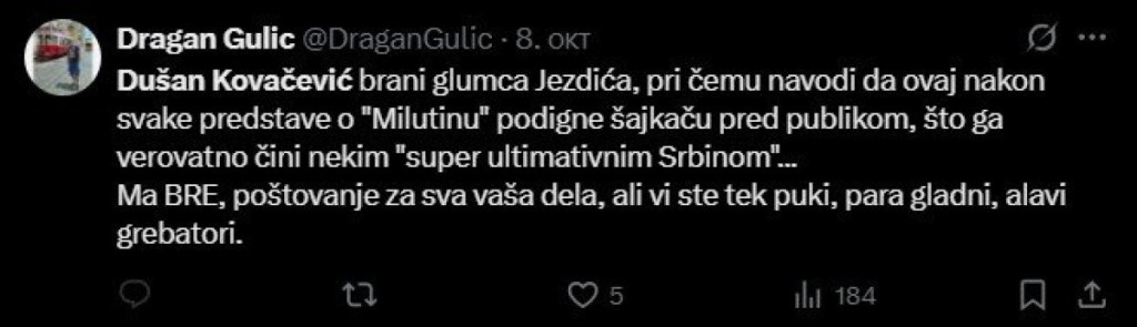 "Ko kaže da neko ko odlično radi svoj posao ne može da bude ništa od čoveka, nula od karaktera. Evo na primer Dušan Kovačević.. ihaj koliko ih ima tek među glumcima", "Dušan Kovačević ne diže šajkaču ali ćuti i smrdi", "Dušan Kovačević brani glumca Jezdića, pri čemu navodi da ovaj nakon svake predstave o `Milutinu` podigne šajkaču pred publikom, što ga verovatno čini nekim `super ultimativnim Srbinom`... Ma bre, poštovanje za sva vaša dela, ali vi ste tek pukli, para gladni, alavi grebatori", samo su neki od sramotnih komentara na društvenoj mreži X upućenih Kovačeviću.