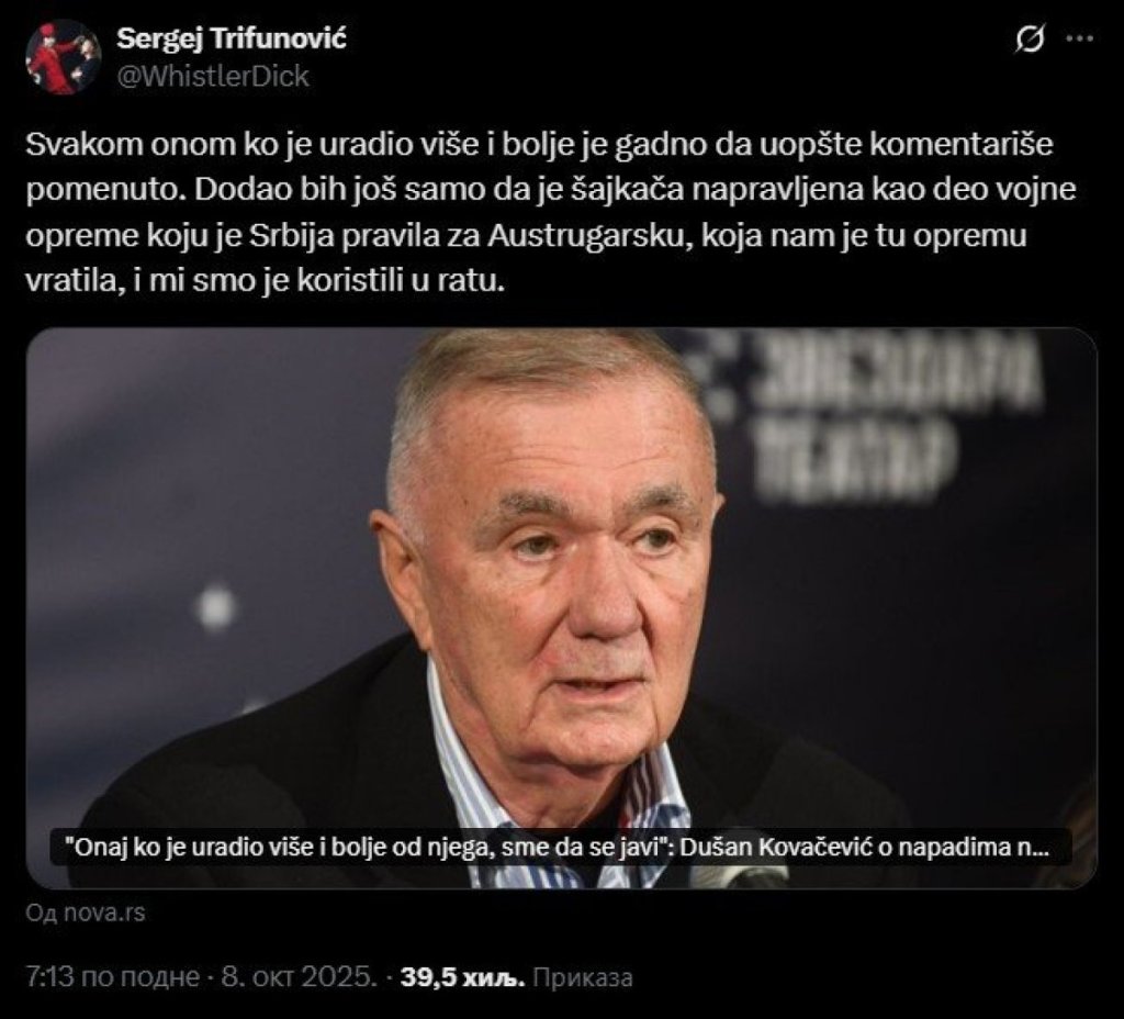 "Svakom onom ko je uradio više i bolje je gadno da uopšte komentariše pomenuto. Dodao bih još samo da je šajkača napravljena kao deo vojne opreme koju je Srbija pravila za Austrugarsku, koja nam je tu opremu vratila, i mi smo je koristili u ratu", napisao je Trifunović na društvenoj mreži X.