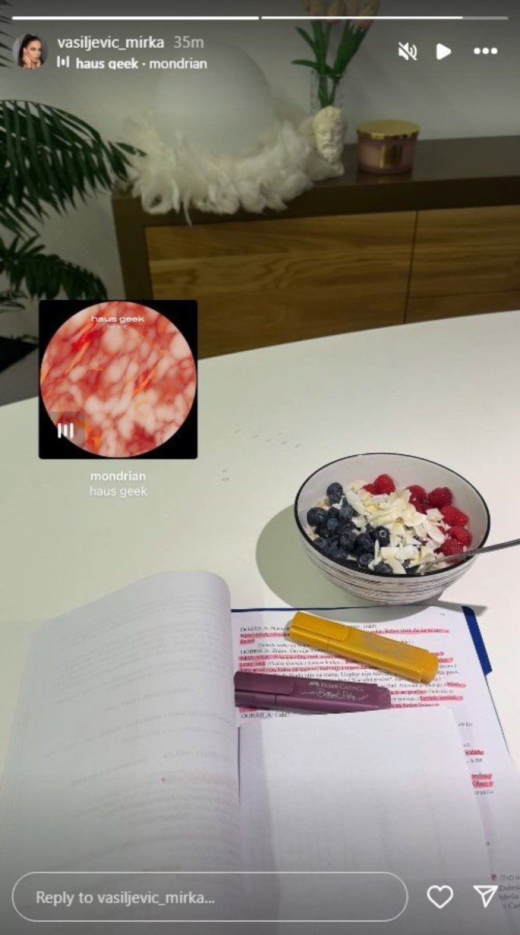 Poznato je da se glumica zdravo hrani, pa se pored scenarija nalazi i činija puna malina, borovnica i badema, što je njen omiljeni način da održi energiju tokom dugih snimajućih dana.