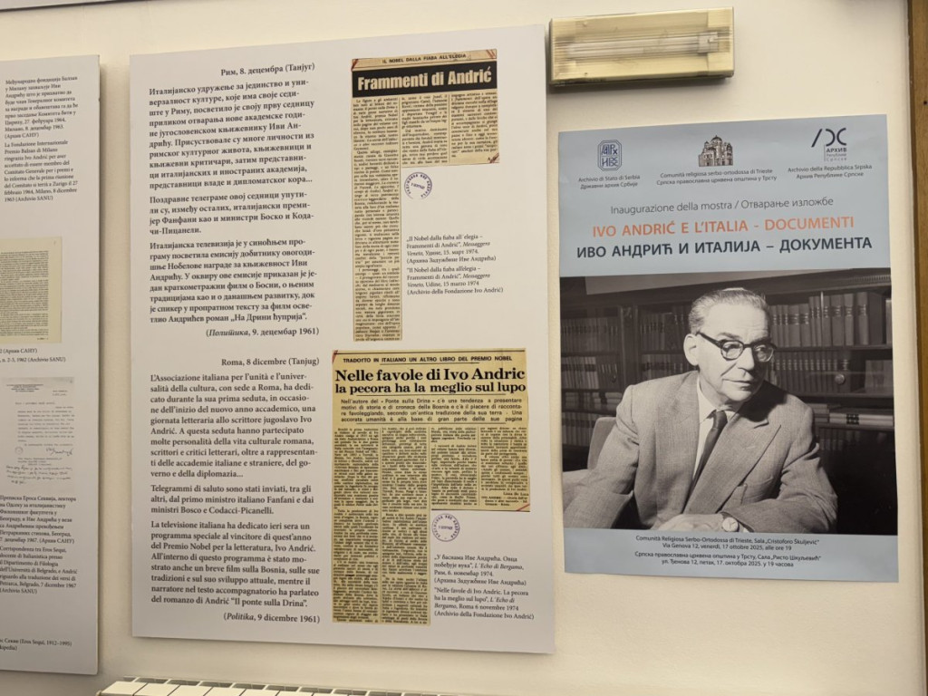 Ministar kulture Nikola Selaković otvorio je u Srpskoj pravoslavnoj crkvenoj opštini u Trstu dvojezičnu izložbu "Ivo Andrić i Italija - dokumenta" ("Ivo Andrić e l’Italia - documenti") upriličenu povodom 50 godina od smrti proslavljenog književnika.
