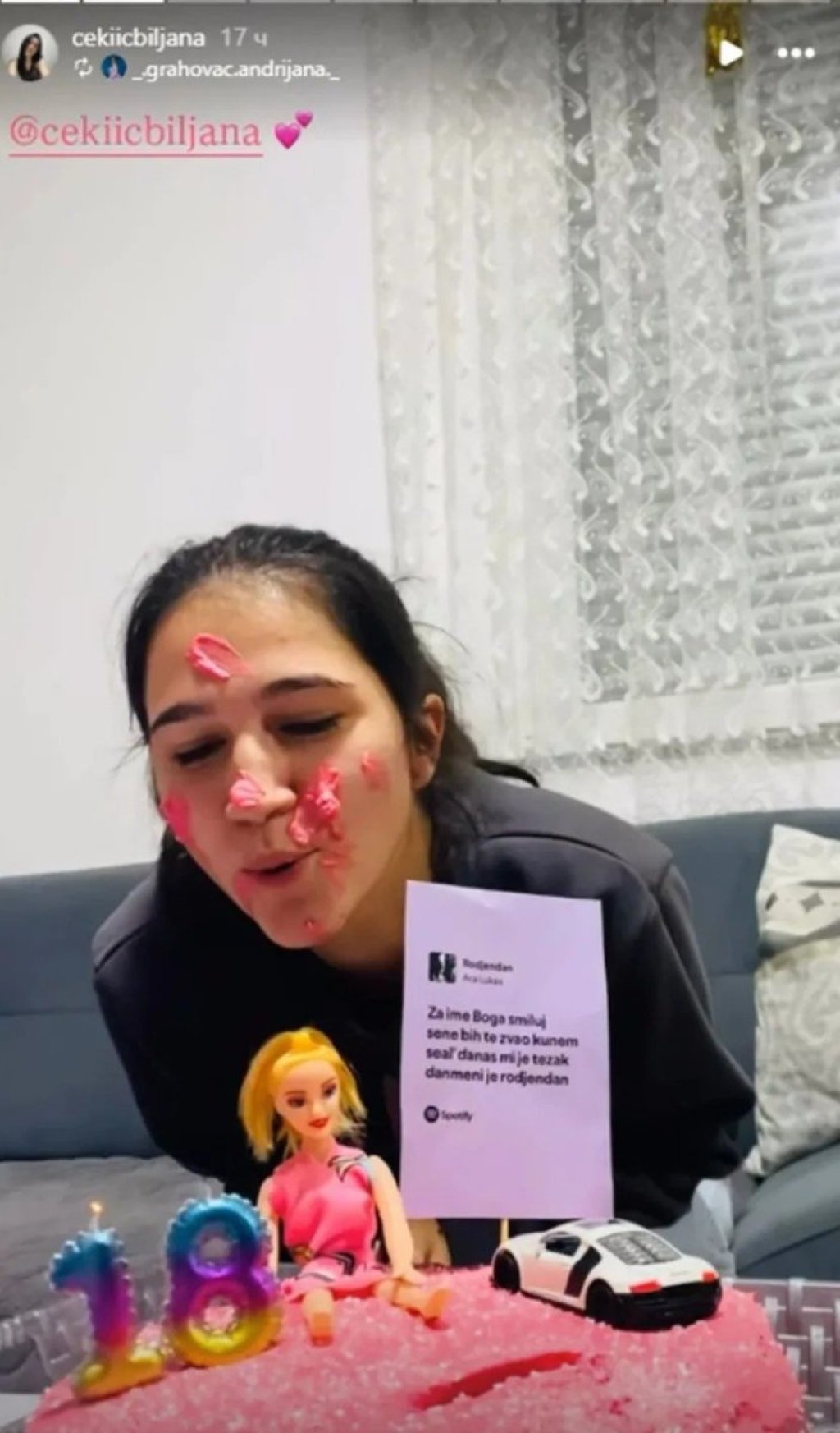 Na slavlju nije izostala roze torta sa Barbikom i automobilom, a sve su posebno ganuli stihovi pesme Ace Lukasa koji su se našli na torti: "Za ime Boga smiluj se. Ne bih te zvao, kunem se, al’ danas mi je težak dan, meni je rođendan."