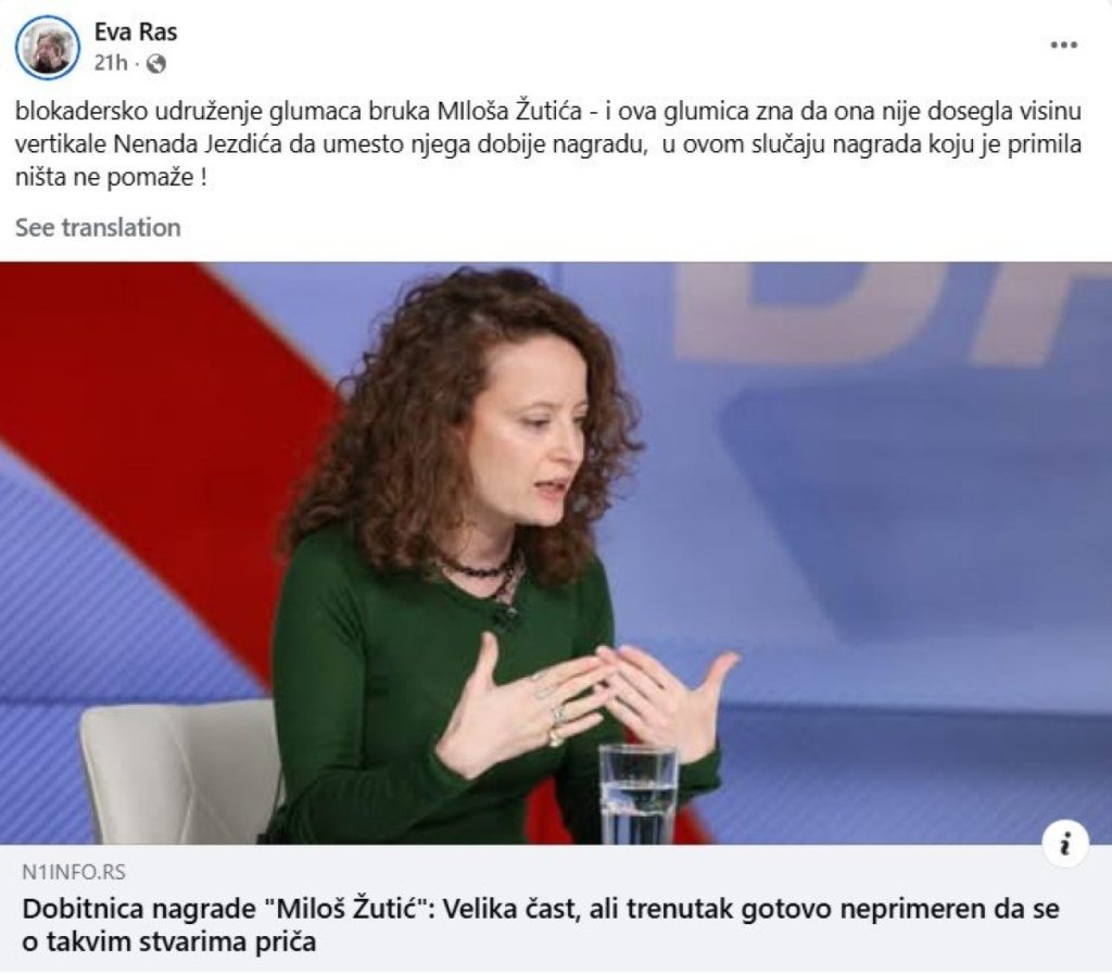 "Blokadersko udruženje glumaca, bruka za Miloša Žutića. Ova glumica zna da ona nije dosegla visinu vertikale Nenada Jezdića da umesto njega dobije nagradu, u ovom slučaju nagrada koju je primila ništa ne pomaže", napisala je Eva na svom Fejsbuk nalogu.
