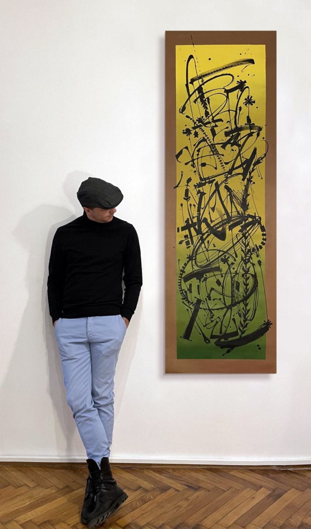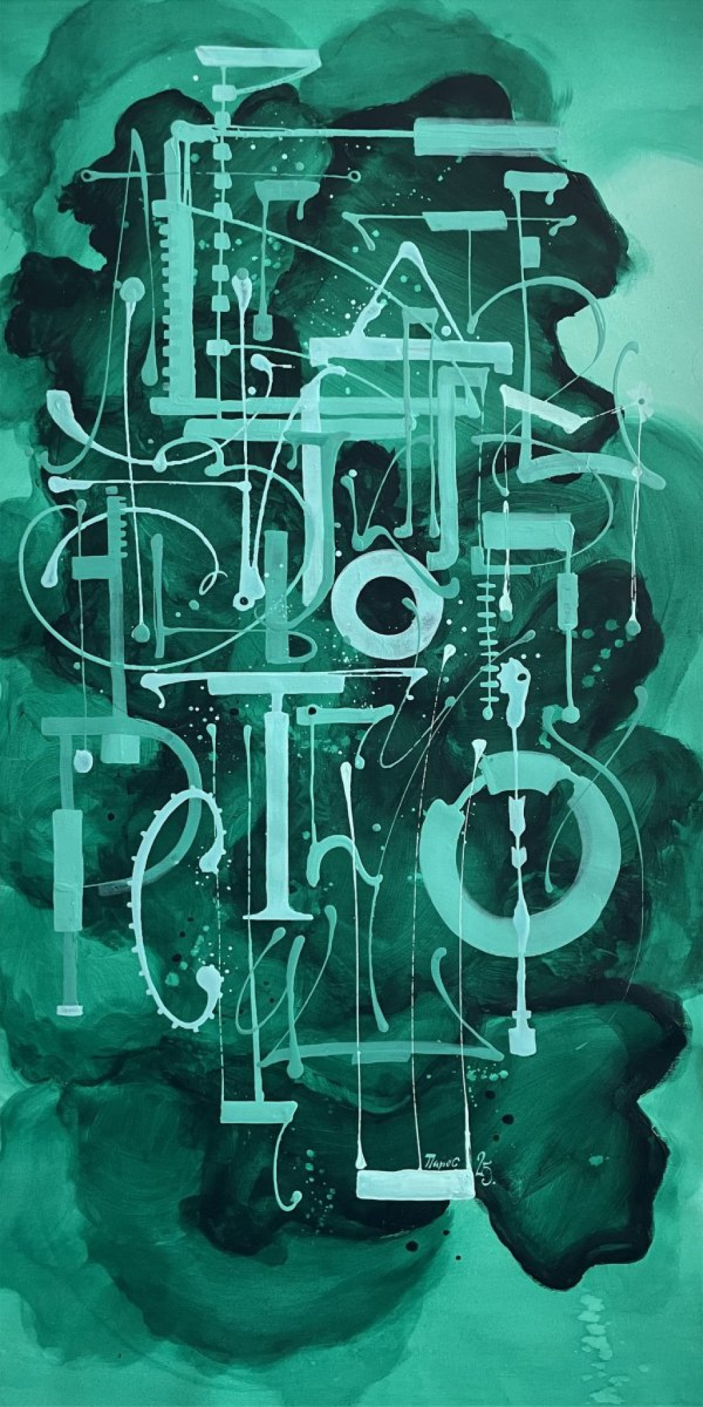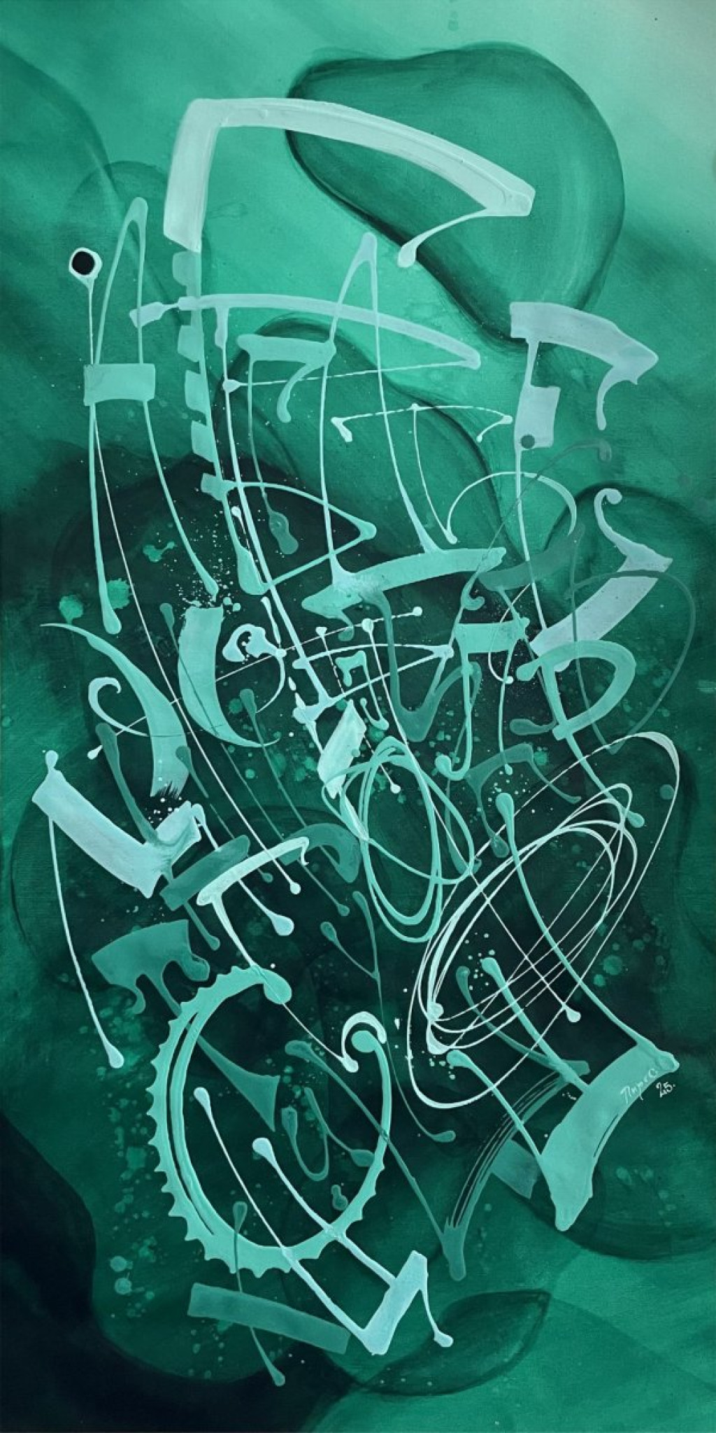 "Binarni etar" je prostor prevođenja, između jezika i zvuka, materijalnog i nematerijalnog. Kao improvizovana partitura, ovi radovi funkcionišu poput džez kompozicija: slobodni, ali vođeni unutrašnjim ritmom. Praznina postaje jednako važna kao i potez, tišina kao i nota. Specifična zelena boja - Phthalocyanine Green koju koristi nosi simboliku trajnosti, obnove i digitalne energije, povezujući neolit i savremenost, materijal i etar.
