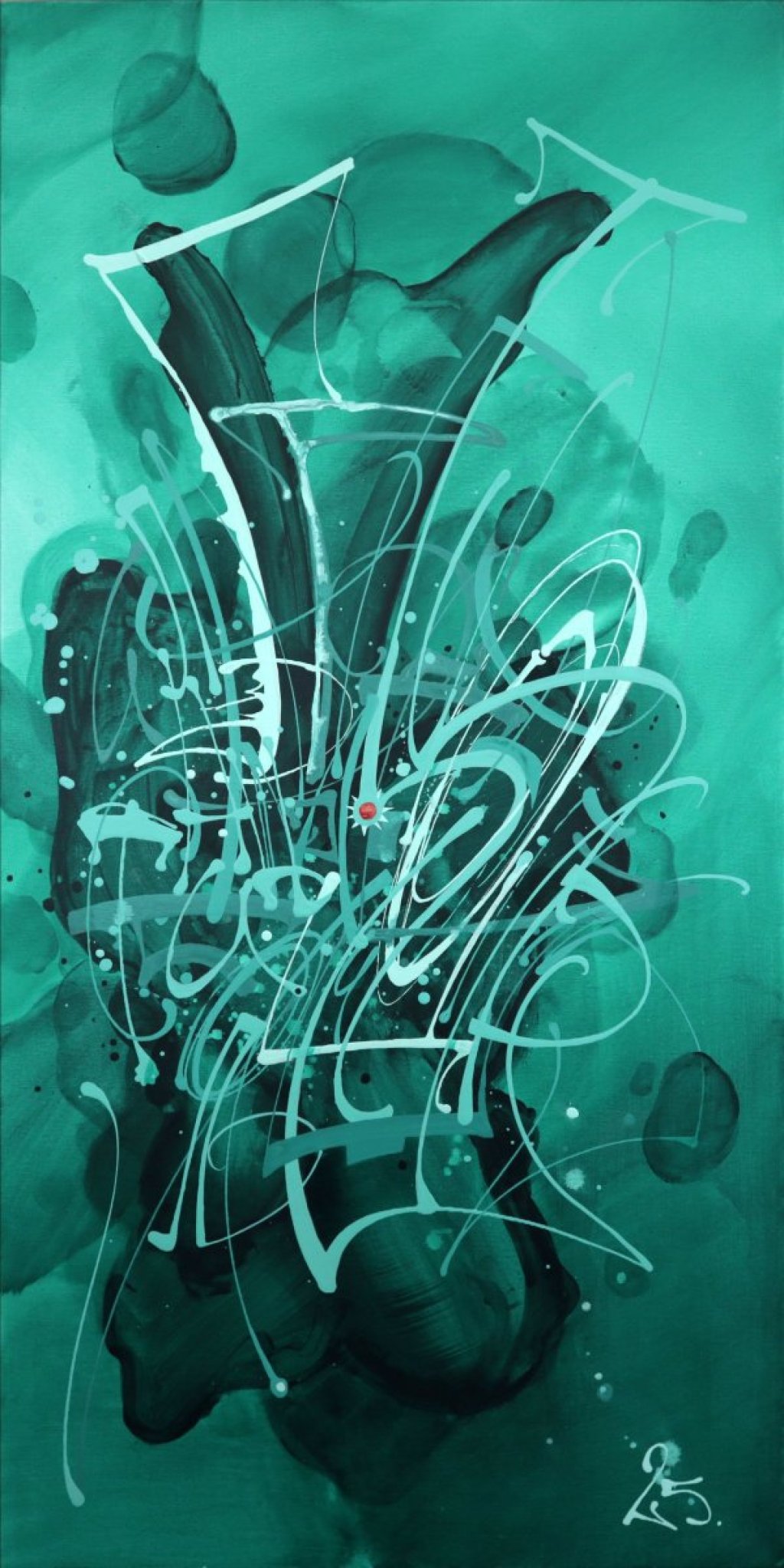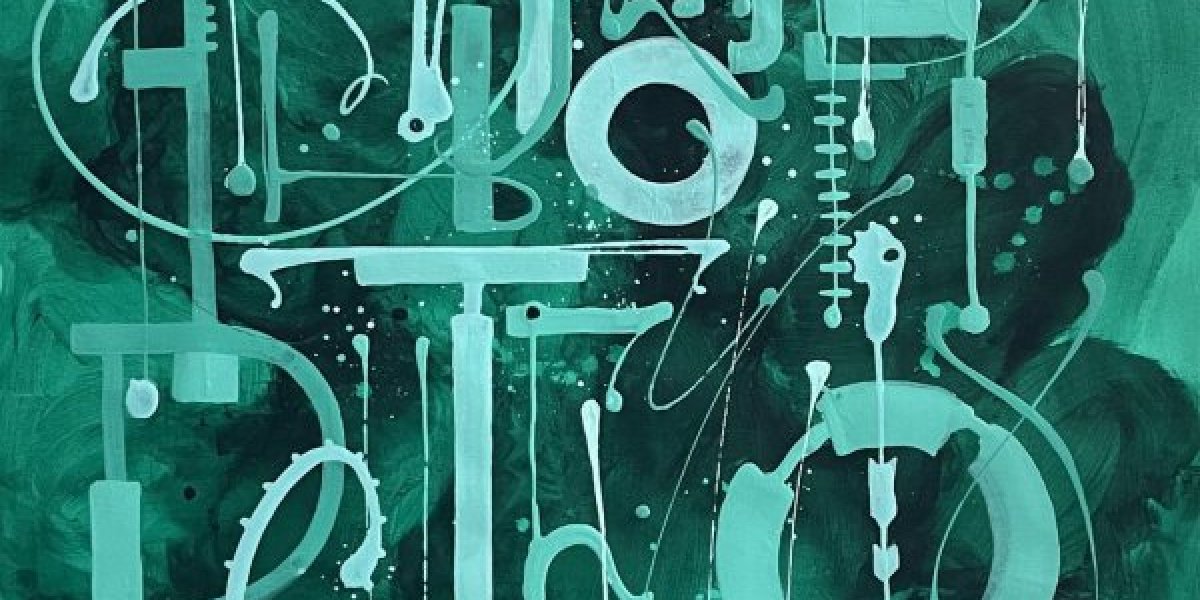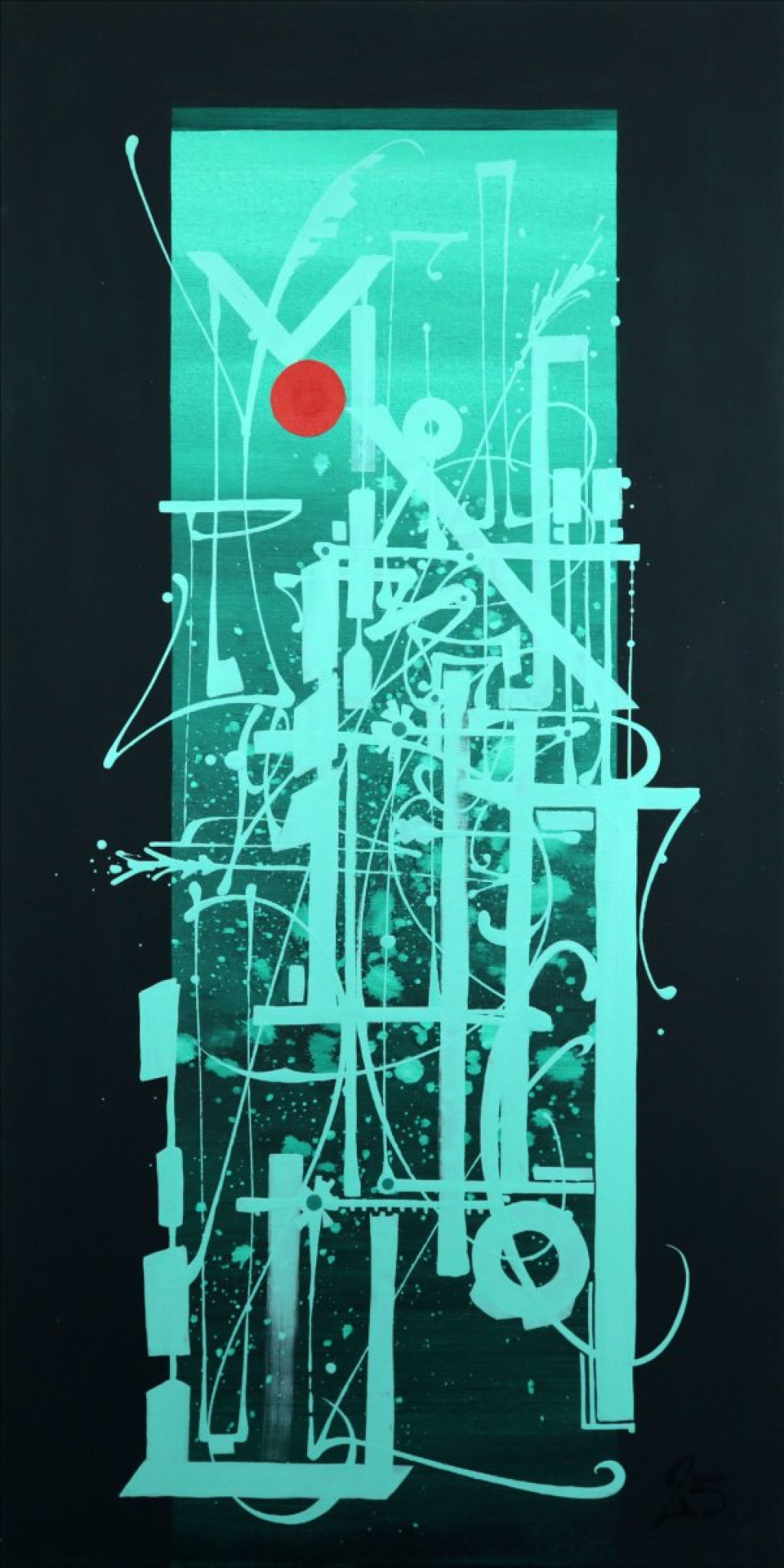 "Binarni etar" je prostor prevođenja, između jezika i zvuka, materijalnog i nematerijalnog. Kao improvizovana partitura, ovi radovi funkcionišu poput džez kompozicija: slobodni, ali vođeni unutrašnjim ritmom. Praznina postaje jednako važna kao i potez, tišina kao i nota. Specifična zelena boja - Phthalocyanine Green koju koristi nosi simboliku trajnosti, obnove i digitalne energije, povezujući neolit i savremenost, materijal i etar.