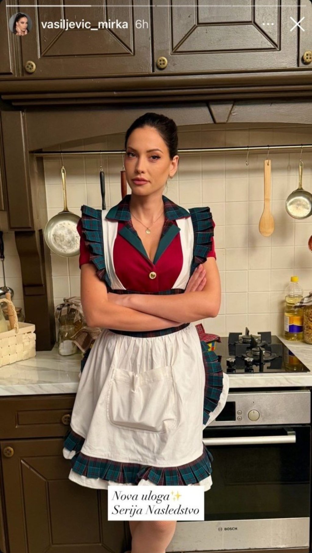Mirka je na Instagramu podelila fotografiju iz kuhinje, obučena u kecelju i naslonjena na šporet. Jasno stavljajući do znanja da tumači lik kuvarice.