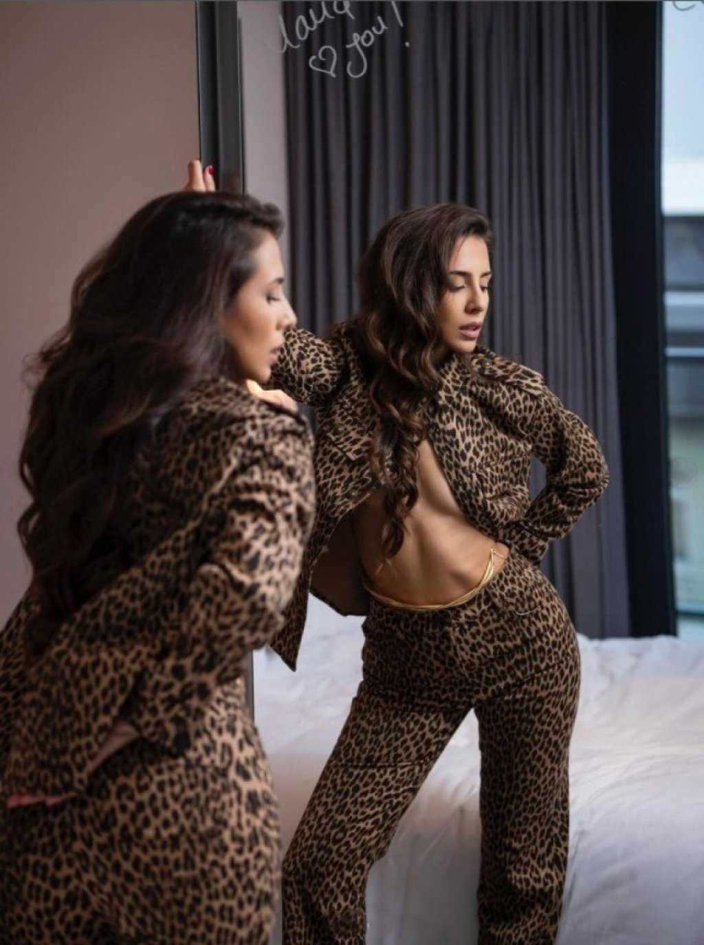 Atraktivna umetnica objavila je i sada zavodljivu objavu uz novogodišnju čestitku. Odabrala je set pantalona i košulje u leopardovom printu koji savršeno ističe njenu vitku figuru i duge noge.