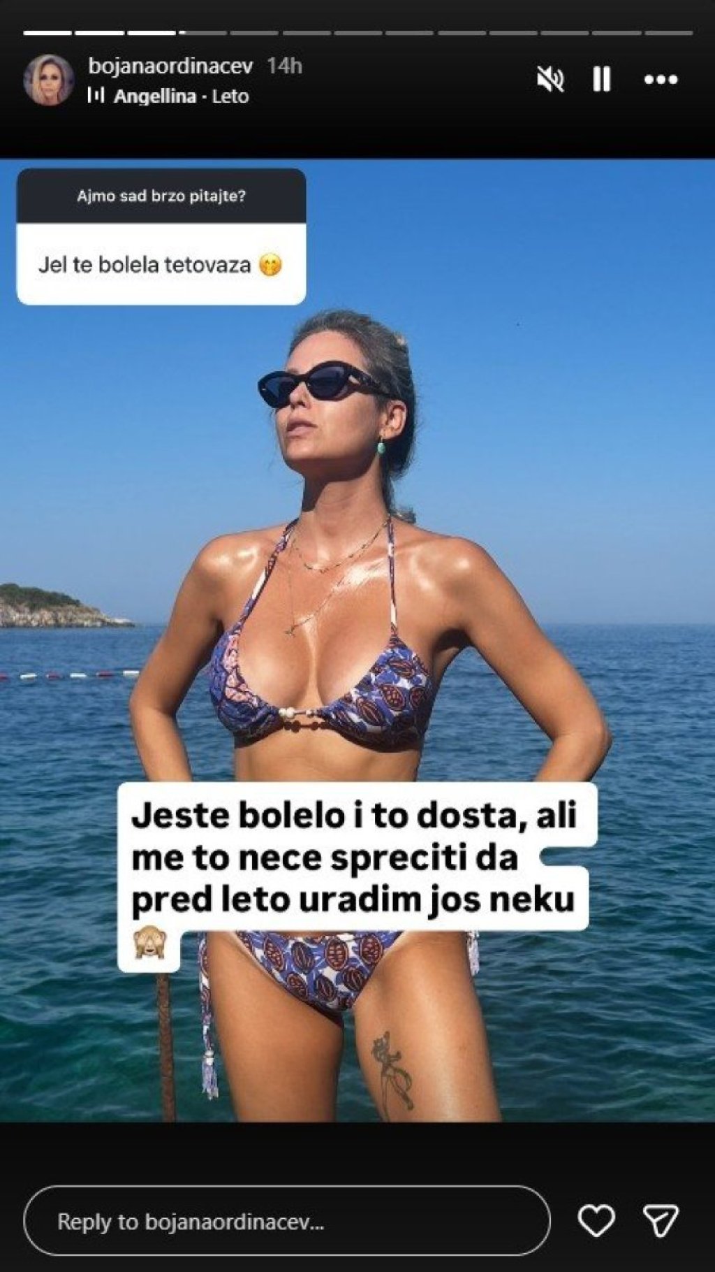Atraktivna glumica Bojana Ordinačev podelila je putem Instagrama fotografiju u bikiniju, pokazavši zavidnu figuru, a komplimenti na njen račun samo su se nizali.