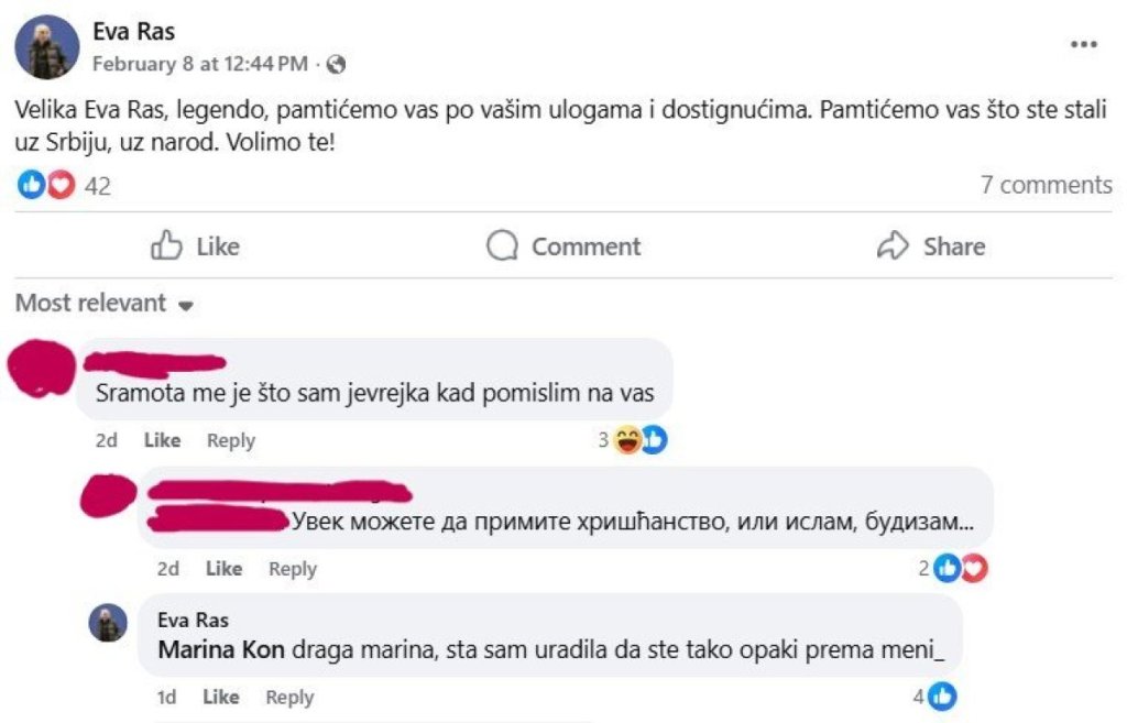 Na zlorudi komentar Eva Ras je odlučila da odgovori, ali na način koji je iznenadio mnoge. Najpre se direktno obratila osobi koja ju je prozvala: "Draga Marina, šta sam uradila da ste tako opaki prema meni?" , upitala je Eva, ali nije dobila odgovor.
