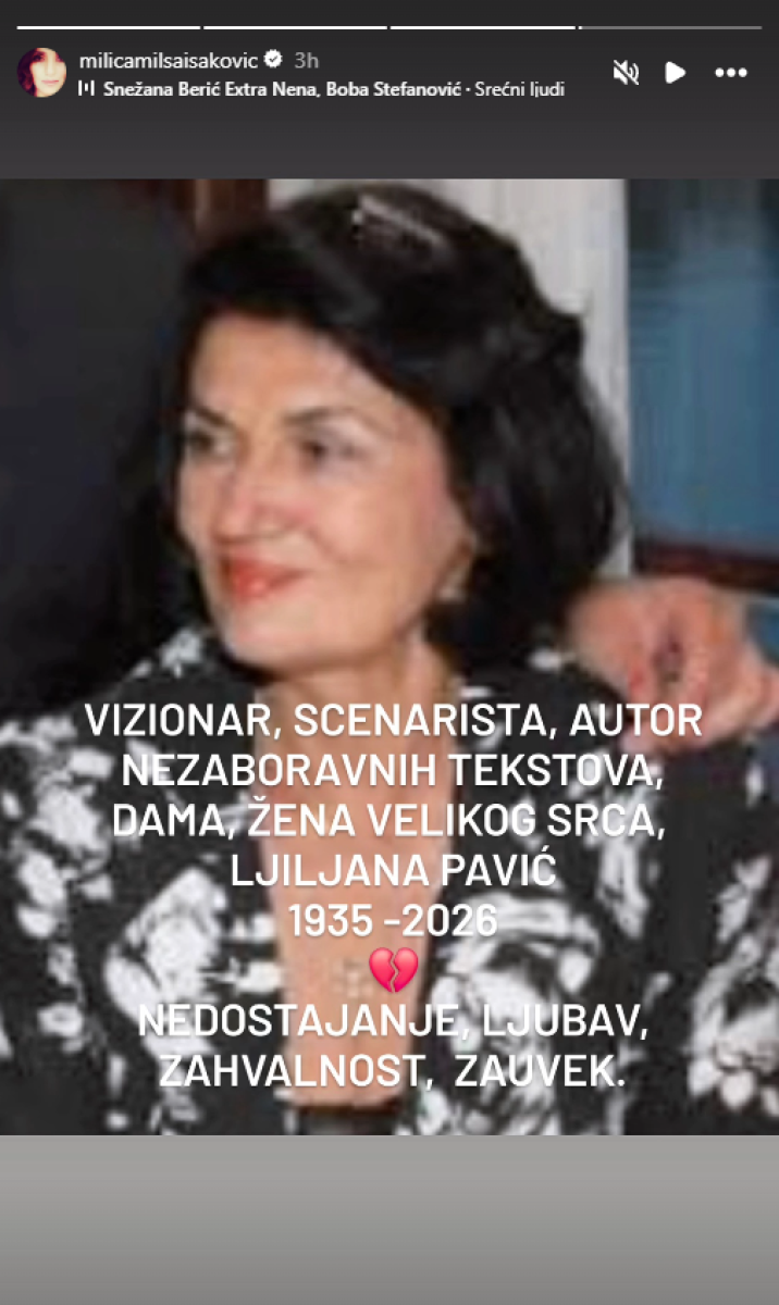 "Vizionar, scenarista, autor mnogobrojnih tekstova, dama, žena velikog srca, Ljiljana Pavić, 1935-2026. Nedostajanje, ljubav, zahvalnost, zauvek", napisala je Milica uz emotikon slomljenog srca.