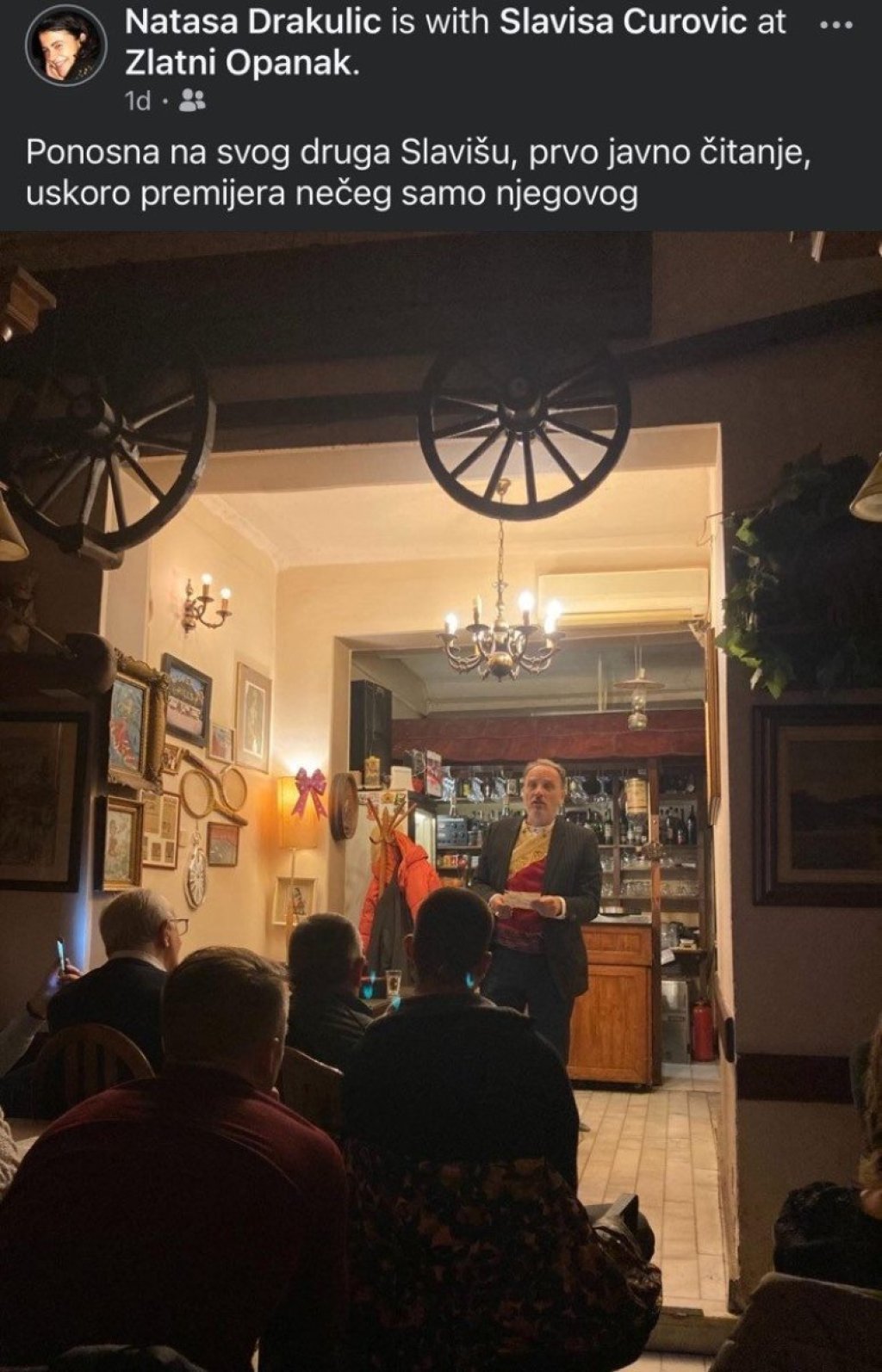 Govoriću ovo svake dve nedelje u kafani 'Zlatni opanak' u Beogradu, jer se tu osećam kao kod kuće, a nedeljom kafana i ne radi osim za ovaj događaj. Pa ko hoće da dođe, dobrodošao je, ulaznice će biti u 'Opanku'. Ukupno staje 50 ljudi. Ne mislite da dolazite na smejanje, na larmu i slično, ovo je tiha i intimna, potpuno istinita priča o jednom junaku koji je ostao živ jer je bio hrabar i pametan.