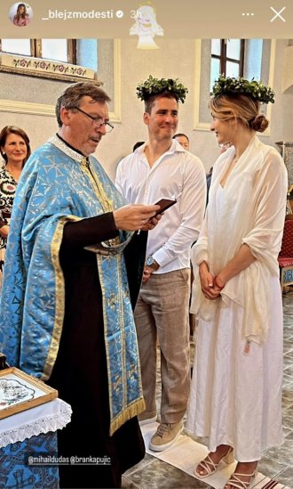 Mlada je blistala u beloj, dugoj korset venčanici sa dubokim šlicem, dugim velom i velikim bidermajerom od raznobojnog cveća, dok je mladoženja nosio tamno odelo i belu košulju, dok je posebno zanimljiv bio detalj koji je nosio na glavi u vidu venca.