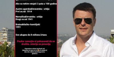 - Ako sa nekim ratuješ tri puta u 100 godina. Austrougarska i Hrvatska: Srbija, Prvi Svetski rat 1914. godina. Nemačka i Hrvatska: Srbija – Drugi svetsi rat 1941. godine. Bratoubilačko-komšijski rat 1991. godina. Sve ukupno osam miliona žrtava. Poruka – Nemojte ni pokušavati da se družite, istorija se ponavlja - napisao je glumac, te dodao: