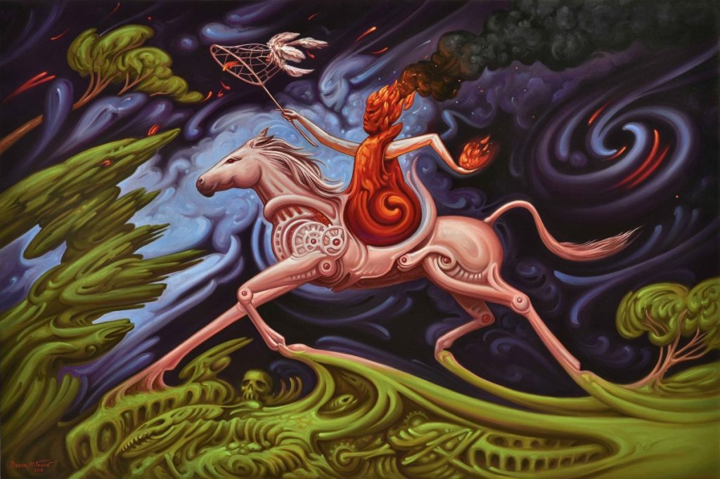 Intenzivan a harmoničan kolorit, večiti nemir i kontrasti... još su neka od obeležja Mitrovićevog recentnog opusa - u fantazmagoričnim kompozicijama akcentovanih humanoidnih jahača izduženih udova, koji su u pokretu ili usnuli, a sintetizuju se sa zemljom i drvećem.