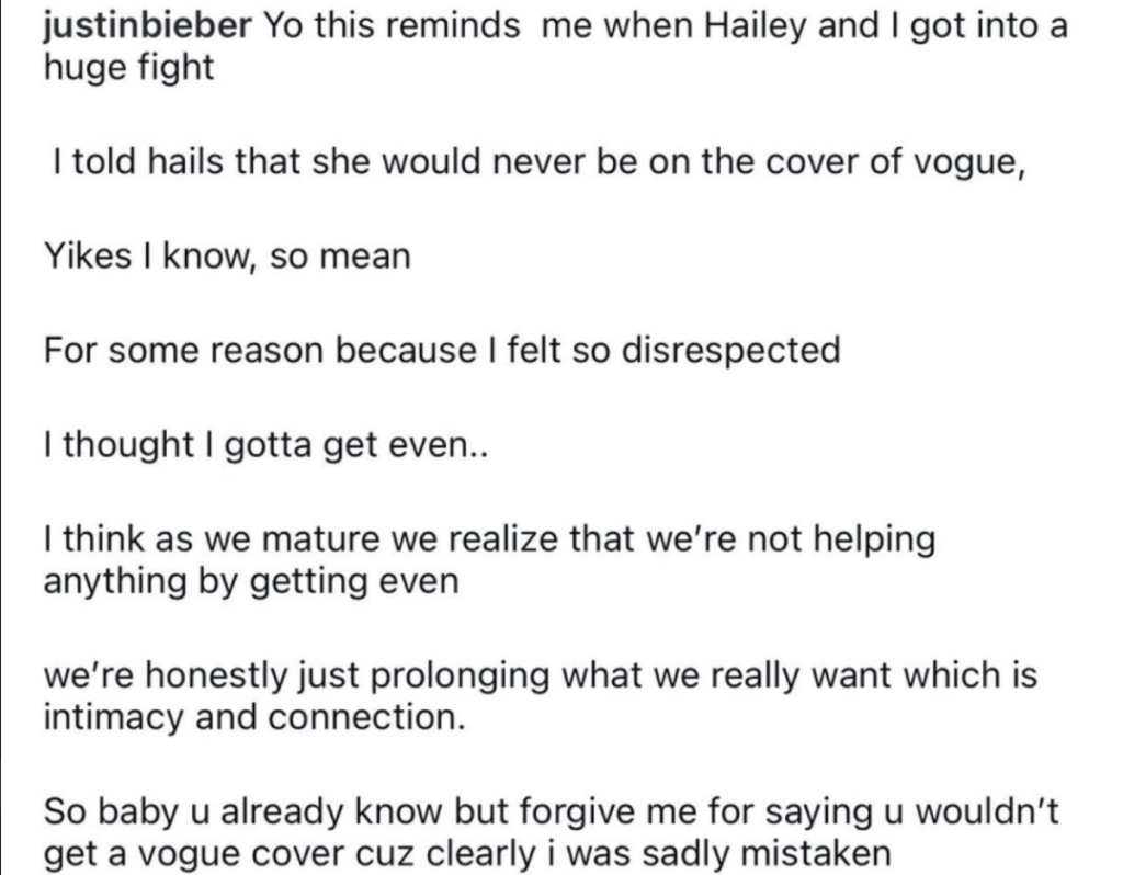"Jao, ovo me podseća na vreme kada smo se Hejli i ja žestoko posvađali. Rekao sam Hejli da nikada neće biti na naslovnoj strani Voga. Jao, znam, baš sam zloban. Mislim da kako sazrevamo, shvatamo da ne pomažemo ništa time što se osvetimo. Iskreno, samo produžavamo ono što zaista želimo, a to je intimnost i povezanost. Pa, dušo, već znaš, ali oprosti mi što kažem da nećeš dobiti naslovnu stranu Voga jer sam očigledno mnogo pogrešio."