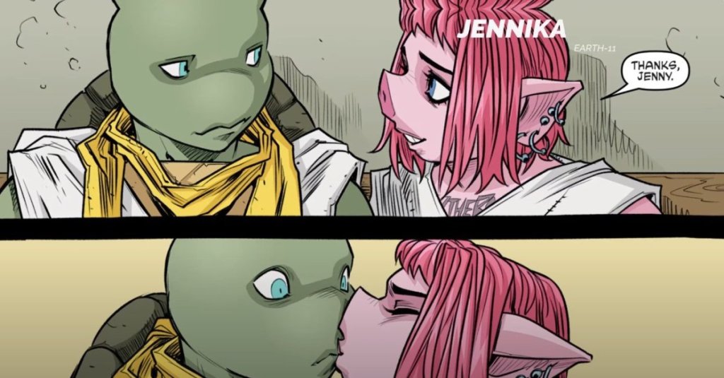 Iako je taj trenutak prikazan suptilno, predstavljao je značajnu prekretnicu, Dženika je postala prva kornjača u franšizi koja je otvoreno kvir.