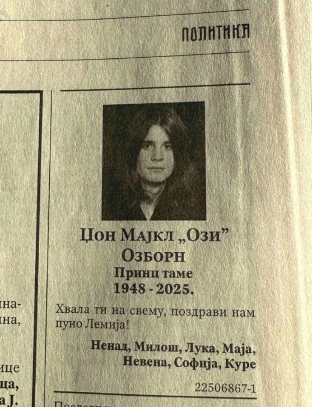 Ova čitulja izazvala je veliku pažnju, posebno među domaćim fanovima, jer potvrđuje koliko je muzika Ozija Ozborna ostavila traga i u Srbiji.