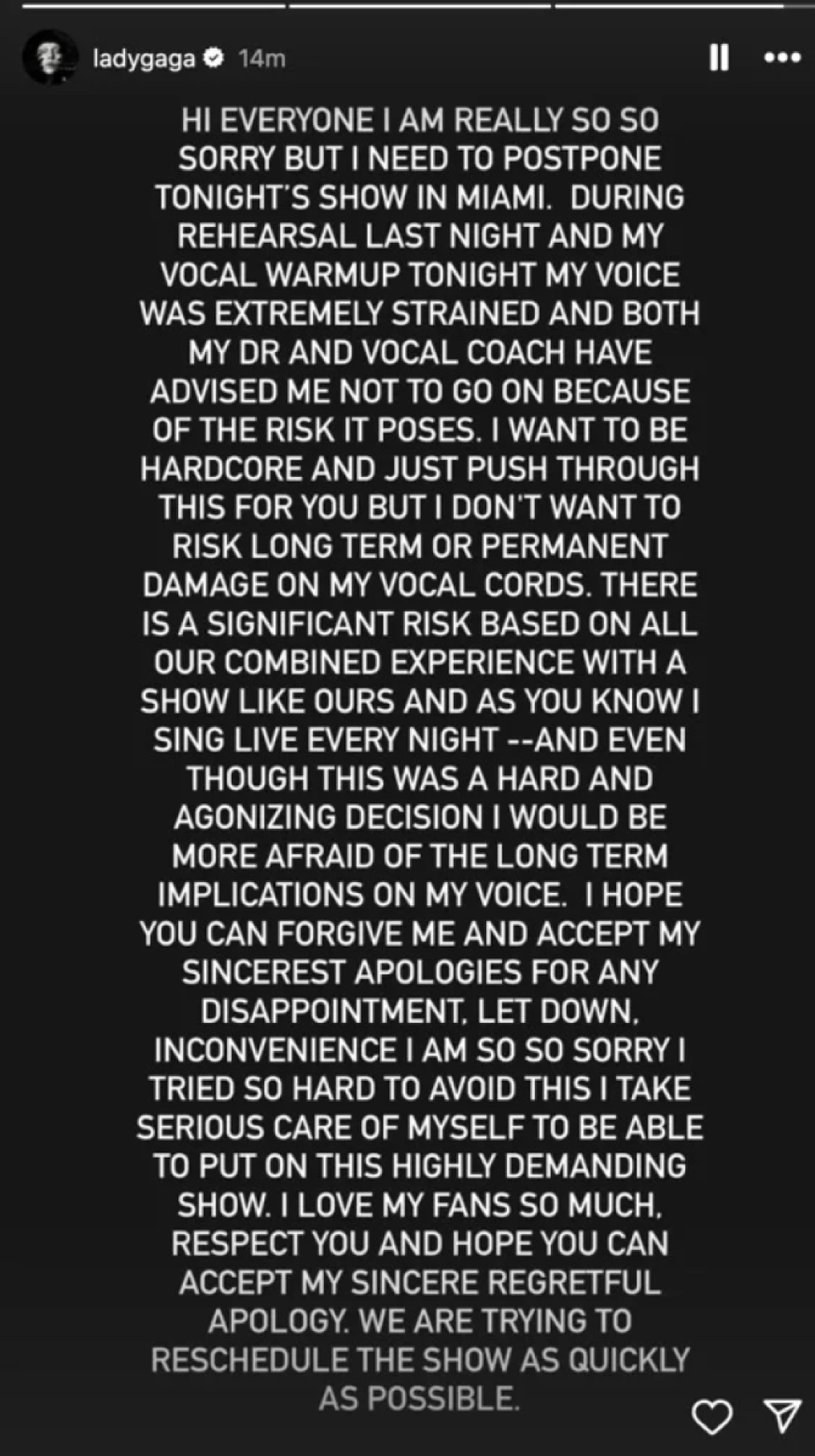Lejdi Gaga se trenutno nalazi na velikoj turneji pod nazivom Mayhem Ball, a iako je publika u Majamiju ostala uskraćena za spektakl, pevačica je naglasila da joj je zdravlje i očuvanje glasa na prvom mestu, kako bi nastavila da nastupa i u narednim godinama.