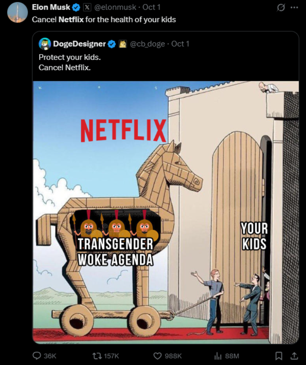 Ilon Mask pozvao je na bojkot i otkazivanje pretplate Netfliksa jer u svojim projektima koji su označeni kao pogodni za decu promovišu transrodne osobe.