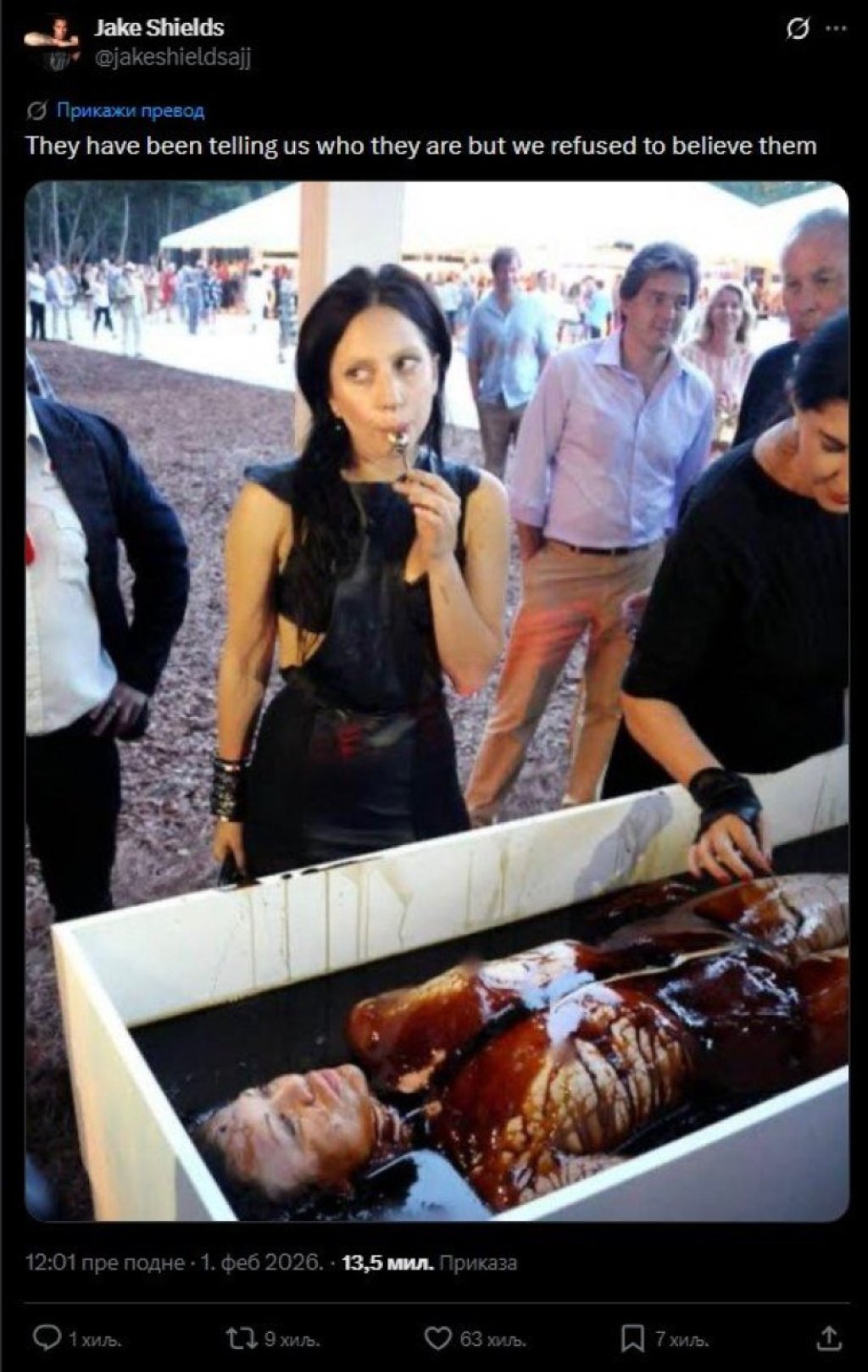 Fotografija prikazuje Lejdi Gagu kako kašikom uzima jestivi "krvavi" sos sa realistične torte u obliku ljudskog tela koje podseća na leš.