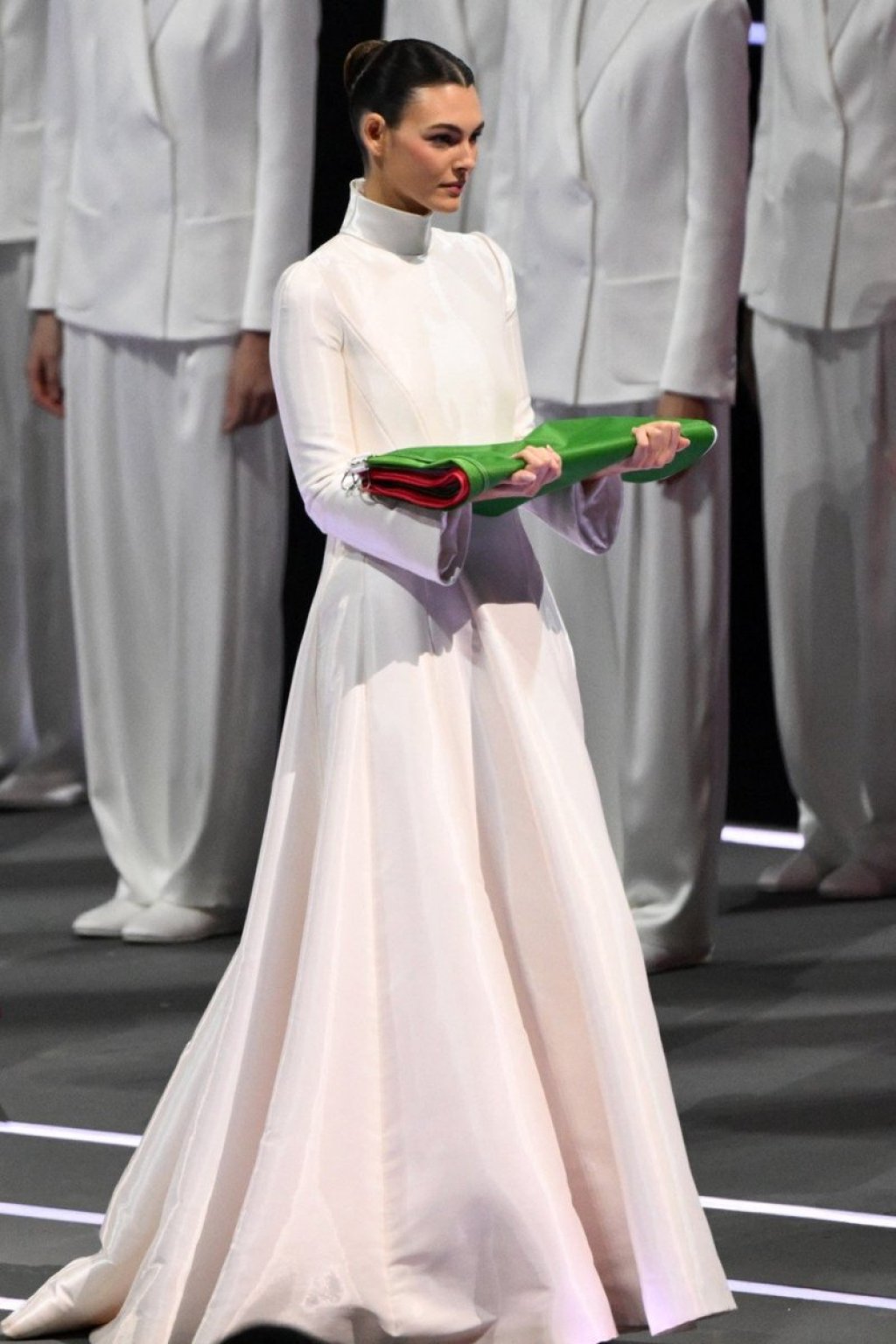 Zastavu je predala elitnoj gardi karabinjera, a njen izlazak izazvao je ovacije i potpunu pažnju publike.