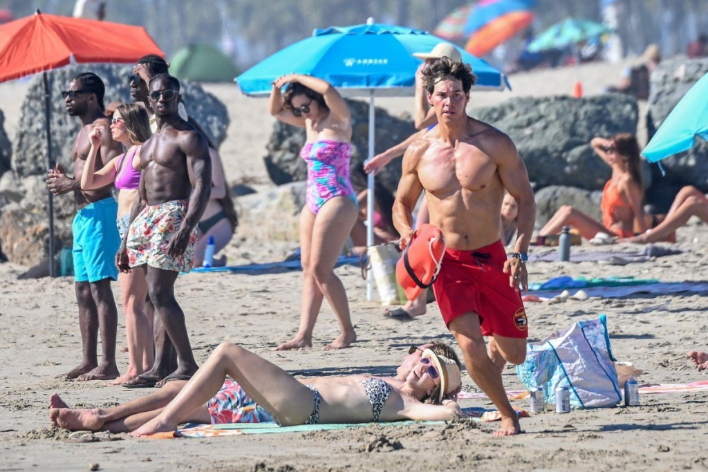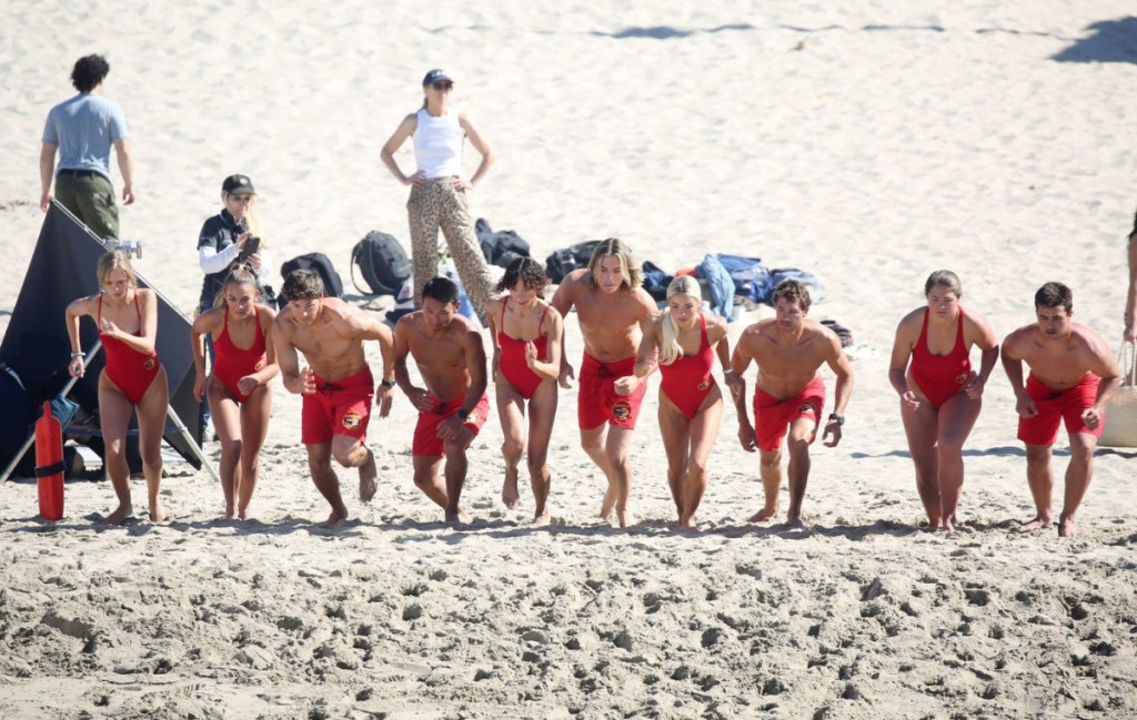Nema odmora pod vrelim suncem Kalifornije. Glumci su uslikani tokom intenzivnih priprema i snimanja prvih scena. U prepoznatljivoj opremi za spasavanje, nova ekipa uvežbava skokove u talase i sprintove po pesku pod budnim okom profesionalnih trenera.
