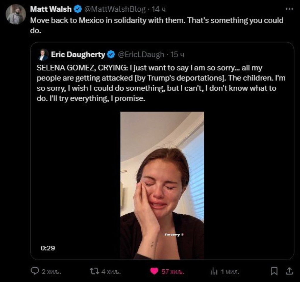 Pevačica i glumica Selena Gomez zaplakala je nekoliko dana nakon što je američki predsednik Donald Tramp doneo odluku da deportuje ilegalne imigrante iz njihove zemlje.