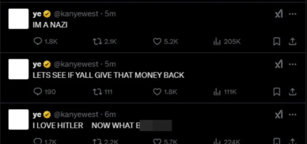 Vest, koji je legalno promenio ime u Je, objavio je: "Volim Hitlera. Šta sad ku*ke?", a zatim nastavio sa nizom šokantnih poruka, uključujući i: "Da vidimo da li ćete sad vratiti novac" i "Ja sam nacista".