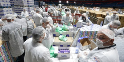 Namirnice pakuju volonteri u “Štark areni”, svaki paket je težak 8,5 kilograma, a sadrži 13 namirnica - kilogram brašna, šećera, litar ulja, paštetu, mesni narezak, kafu, čaj, supu, deterdžent, sapun, toalet papir…